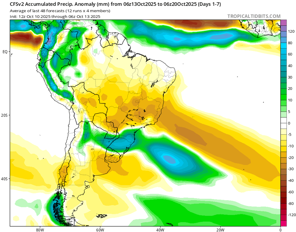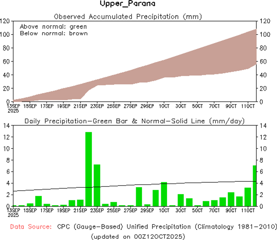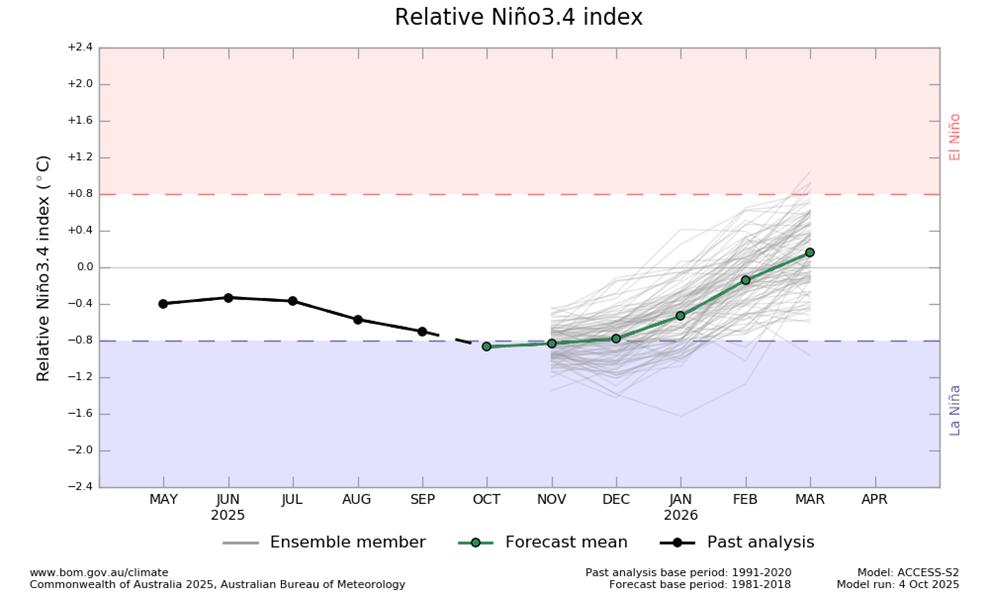 El fenómeno de El Niño-Oscilación del Sur (ENOS) se mantiene neutral. El último valor relativo del índice de temperatura superficial del mar (TSM) Niño3.4 para la semana que finalizó el 28 de septiembre de 2025 es de -0,80 °C. Los valores entre -0,8 °C y +0,8 °C se consideran neutrales respecto al ENOS, mientras que los valores sostenidos por debajo de -0,8 °C (durante al menos tres meses) se consideran indicativos de La Niña.