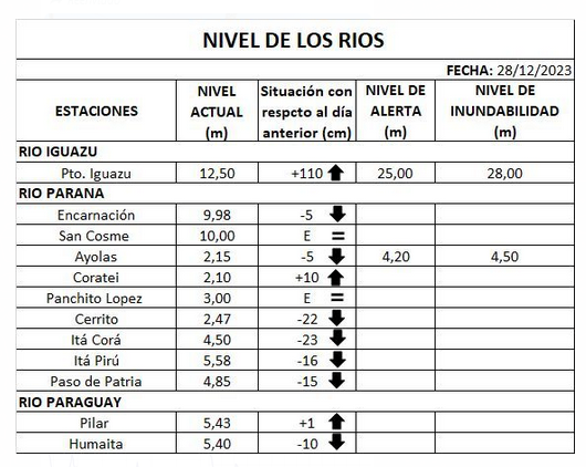 Previsión de Alturas:22-12-23: 2.8m/3.1m23-12-23: 2.8m/2.6m24-12-23: 2.6m/2.4m25-12-23: 2.4m/2.2m26-12-23: 2.0m/2.2mObs.:Las previsiones de Alturas son realizadas considerando las condiciones actuales y pronósticos disponibles y están sujetas a revisión en función de eventuales cambios.