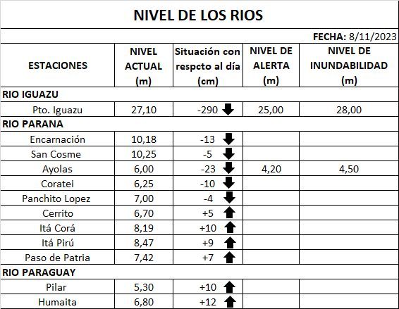 Río Paraná: estado de situación al martes, 07 de noviembre de 2023 ATENCIÓN GENERAL: El presente mensaje va dirigido a la sociedad civil en general y a los gestores del territorio, para el diseño de las acciones que estimen sean convenientes. Continuando con los mensajes elaborados por la Entidad Binacional Yacyretá, se informa que los […]