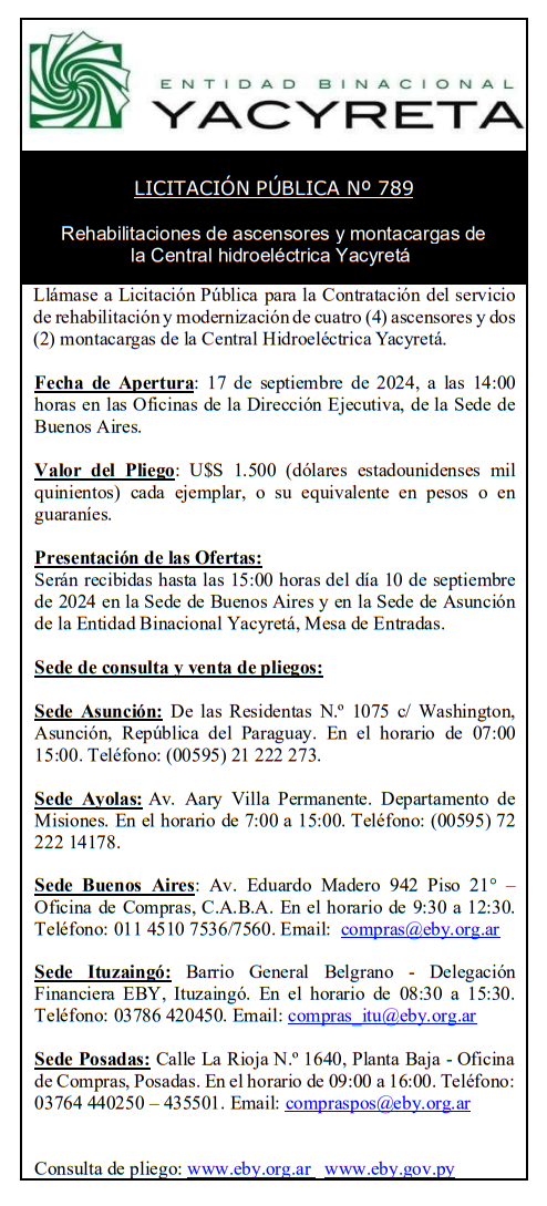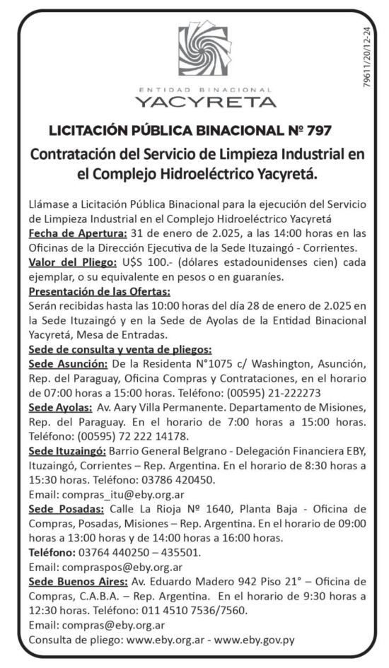 Licitación Pública Binacional N° 797 – Contratación de Servicio de Limpieza Industrial en el Complejo Hidroeléctrico Yacyretá
