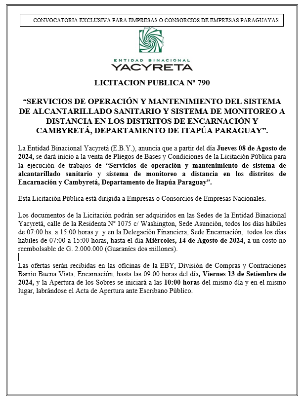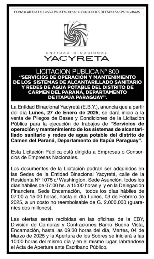 LICITACIÓN PÚBLICA Nº 800 – OPERACIÓN Y MANTENIMIENTO DE LOS SISTEMAS DE ALCANTARILLADO SANITARIO Y REDES DE AGUA EN CARMEN DEL PARANÁ