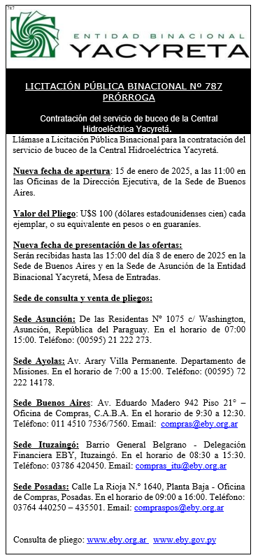Licitación Pública Binacional N° 787 – Contratación del servicio de buceo de la Central Hidroeléctrica Yacyretá (Prórroga)