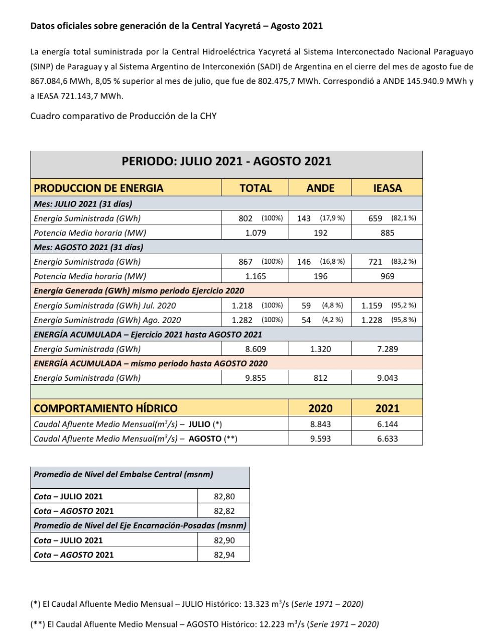 Informe oficial sobre generación de la Central Hidroeléctrica Yacyretá del mes de agosto de 2021