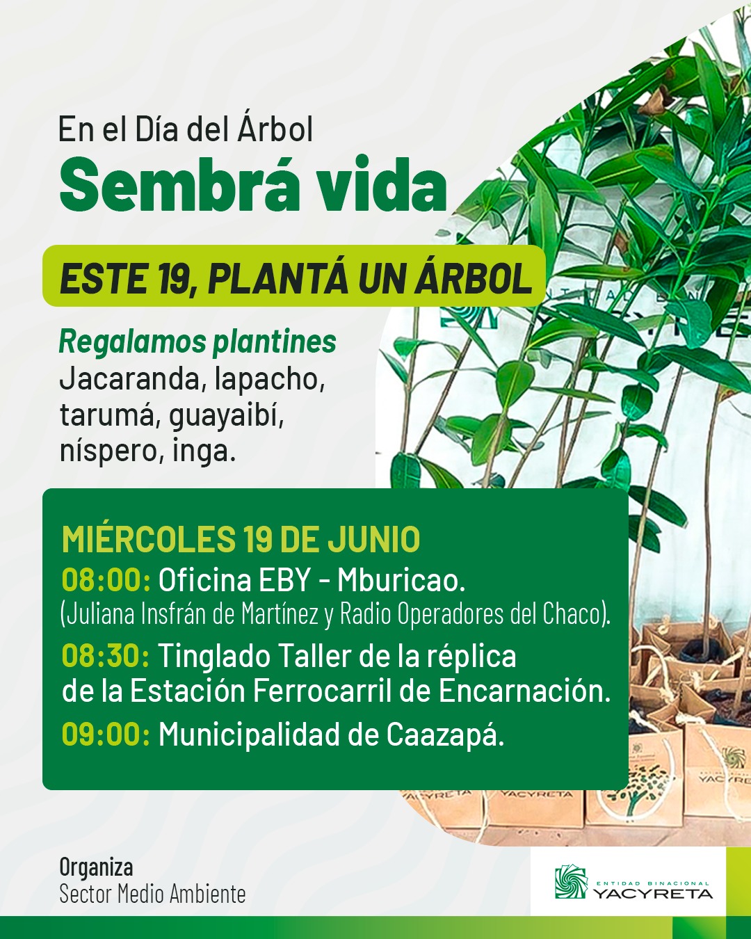 El Día del Árbol se conmemora mañana en nuestro país y la Entidad Binacional Yacyretá (EBY) se une a la celebración con importantes acciones. En efecto, en la sede Mburicao, ubicada en Juliana Insfrán de Martínez y Radio Operadores del Chaco, de Asunción, se prevé la jornada denominada “Sembrá Vida”, oportunidad en que la EBY […]