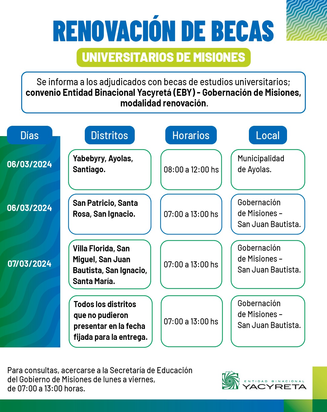Los universitarios beneficiados con el Programa de Becas de la Entidad Binacional Yacyretá (EBY) en convenio con la Gobernación de Misiones, deberán presentar los documentos requeridos para la renovación de las bolsas de estudio correspondientes a 2024, entre este miércoles 6 y mañana, jueves 7 de marzo. El esquema de presentación es el siguiente: los […]