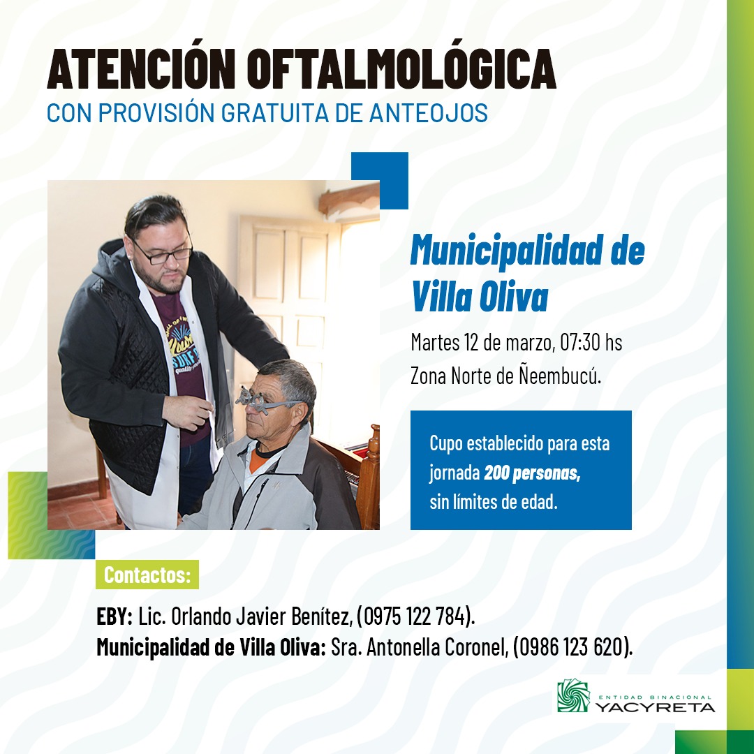 La Entidad Binacional Yacyretá (EBY) continúa desarrollando acciones para asistir a familias vulnerables de diferentes distritos de Ñeembucú. En esta oportunidad, pobladores de Villa Oliva, Villa Franca y Alberdi recibirán asistencia oftalmológica con provisión gratuita de anteojos. Se inicia mañana martes 12 de marzo, a partir de las 07:30 horas en la municipalidad de Villa […]