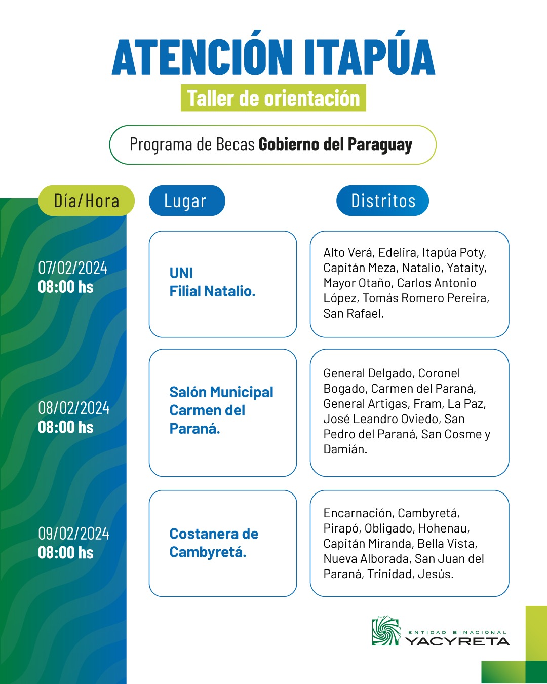 La Entidad Binacional Yacyretá (EBY), a través de su Coordinación General del Área Social, llevará adelante tres talleres de orientación para jóvenes que desean acceder al programa “Becas Gobierno del Paraguay”, quienes se presentaran a los exámenes el próximo sábado 10 de febrero del año en curso. El primer taller se realizará para jóvenes del […]