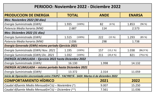 Datos oficiales sobre generación de la Central Hidroeléctrica Yacyretá – diciembre 2022