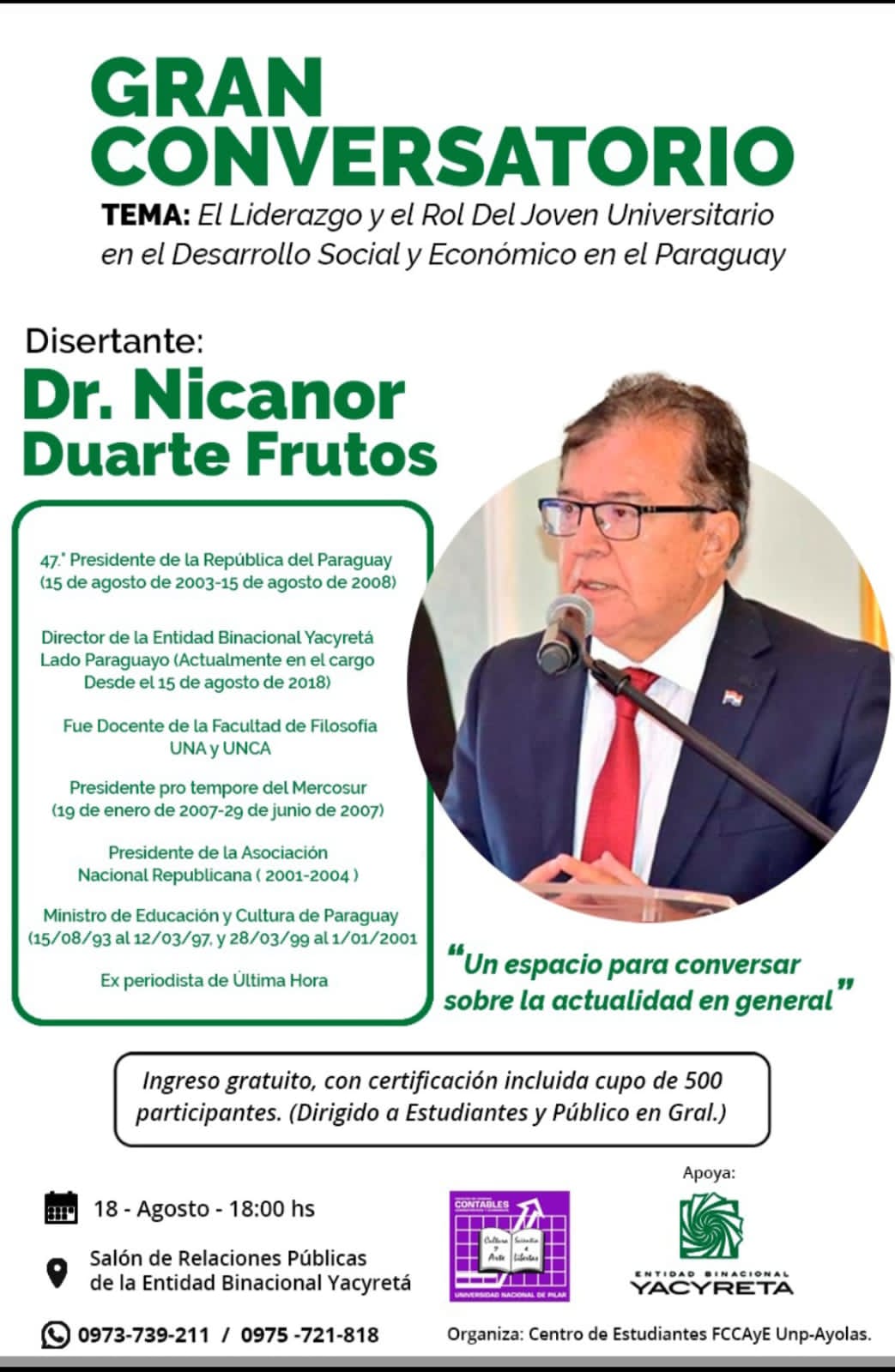 “El liderazgo y el rol del joven universitario en el desarrollo social y económico en el Paraguay”, es el tema de un conversatorio que ofrecerá el expresidente de la República y actual director de la Entidad Binacional Yacuretá, Nicanor Duarte Frutos.El encuentro es organizado por el Centro de Estudiantes de la Facultad de Ciencias Contables, […]