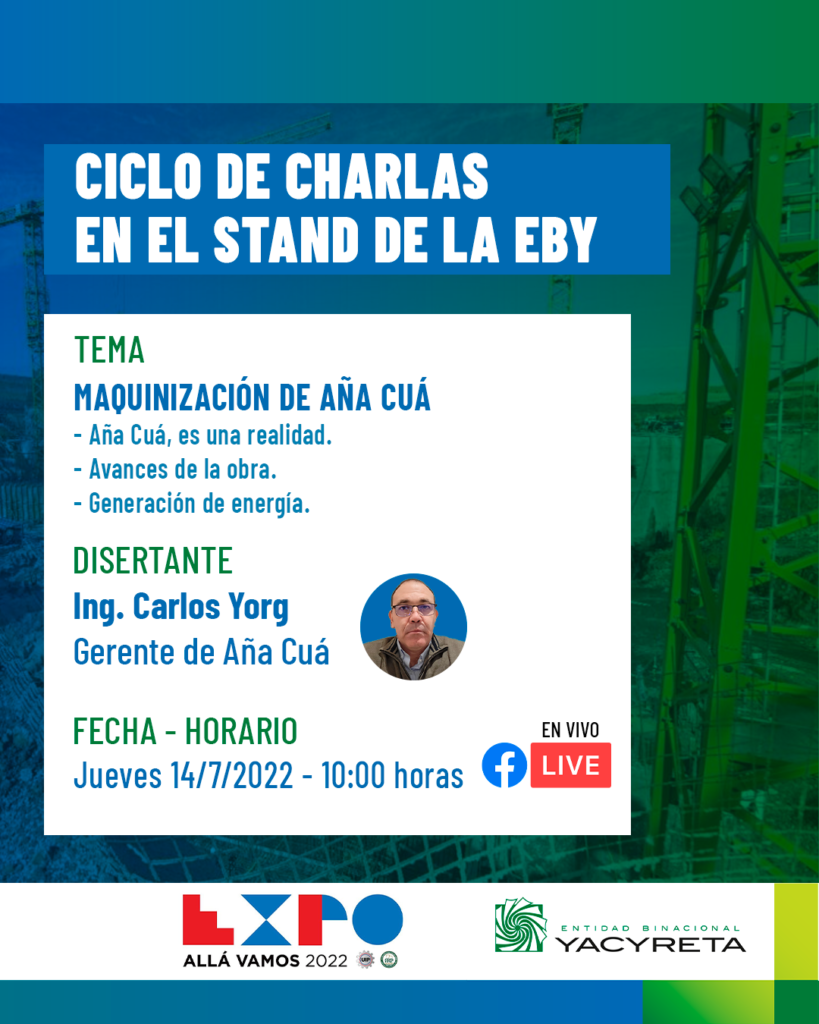 La Entidad Binacional Yacyretá inicia mañana, en su stand en la Expo 2022, una serie de charlas sobre distintas áreas que tienen que ver con iniciativas llevadas adelante por la institución, su funcionamiento, desafíos, presente y futuro. El tema de este jueves es “Maquinización de Aña Cuá”, una obra largamente postergada que se hizo realidad bajo la actual administración gubernamental. Estará a cargo del gerente de Aña Cuá, Ing. Carlos Yorg. El inicio está marcado para las 10:00.