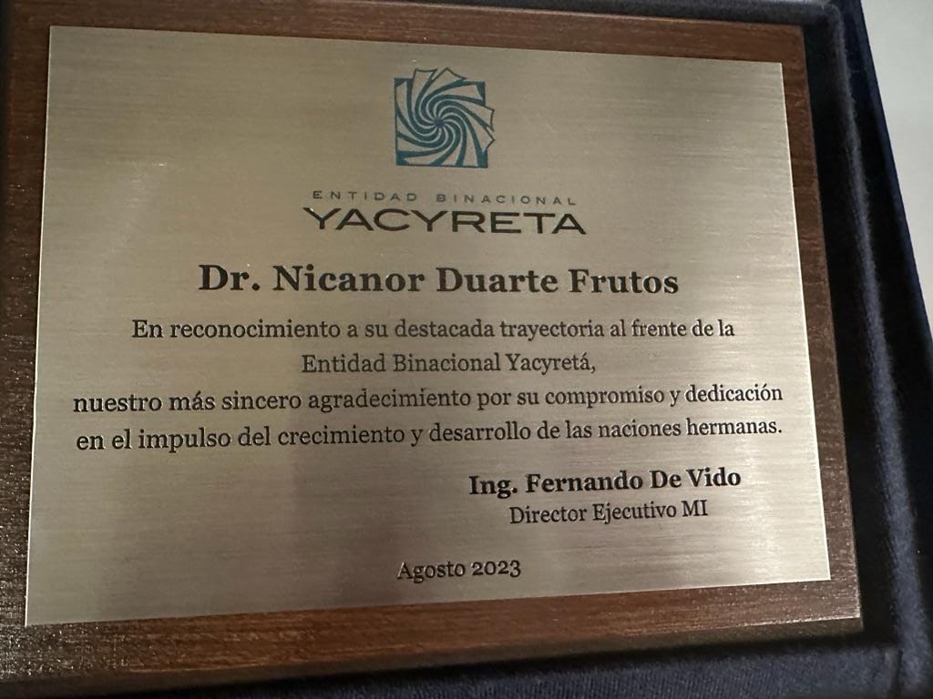 Con posterioridad, entregó una placa conmemorativa a Duarte Frutos, la cual menciona: “Al Dr. Nicanor Duarte Frutos. En reconocimiento a su destacada trayectoria al frente de la Entidad Binacional Yacyretá, nuestro más sincero agradecimiento por su compromiso y dedicación en el impulso del crecimiento y desarrollo de las naciones hermanas. Ing. Fernando De Vido. Director Ejecutivo MI. Agosto 2023”.