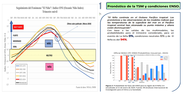 La Perspectiva ENSO se encuentra actualmente en ‘Vigilancia de La Niña’, lo que significa que hay algunas señales de que La Niña podría formarse en el Océano Pacífico más adelante en 2024. Los indicadores atmosféricos y oceánicos se encuentran actualmente dentro de los umbrales neutrales de ENSO.