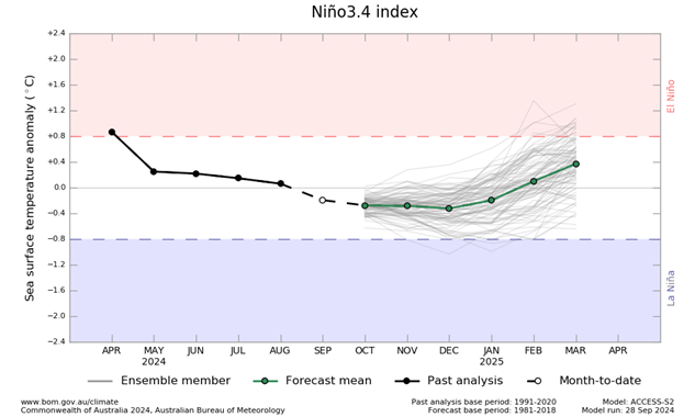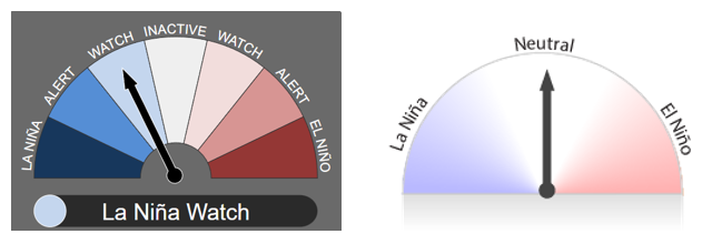 La Perspectiva ENSO se encuentra actualmente en ‘Vigilancia de La Niña’, lo que significa que hay algunas señales de que La Niña podría formarse en el Océano Pacífico más adelante en 2024. Los indicadores atmosféricos y oceánicos se encuentran actualmente dentro de los umbrales neutrales de ENSO.