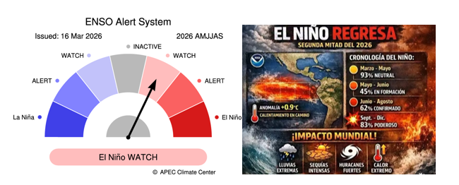 • El fenómeno de La Niña de 2025-2026 está llegando a su fin. Las temperaturas de la superficie del mar en el Pacífico tropical central han superado el umbral de La Niña (−0,80 °C) durante las últimas cuatro semanas, registrándose el último valor relativo del índice Niño3.4 para la semana que finalizó el 15 de marzo de 2026 en -0,53 °C. El calentamiento en las capas subsuperficiales sugiere que es probable que el fenómeno continúe disminuyendo en las próximas semanas.