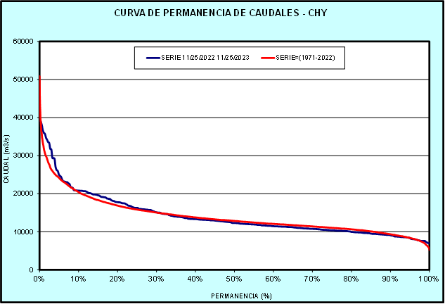 El caudal afluente a la CHY diario, pronosticado para la fecha de hoy es de 16.600 m3/s, y para el día de mañana se espera una afluencia del orden de 15.000 m3/s.