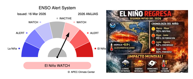 • El fenómeno de La Niña de 2025-2026 está llegando a su fin. Las temperaturas de la superficie del mar en el Pacífico tropical central han superado el umbral de La Niña (−0,80 °C) durante las últimas cuatro semanas, registrándose el último valor relativo del índice Niño3.4 para la semana que finalizó el 15 de marzo de 2026 en -0,53 °C. El calentamiento en las capas subsuperficiales sugiere que es probable que el fenómeno continúe disminuyendo en las próximas semanas.