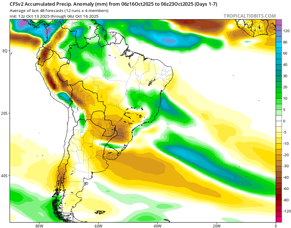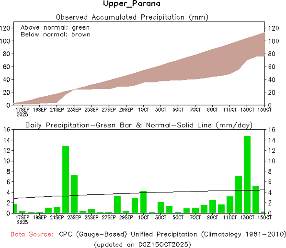 El fenómeno de El Niño-Oscilación del Sur (ENOS) se mantiene neutral. El último valor relativo del índice de temperatura superficial del mar (TSM) Niño3.4 para la semana que finalizó el 28 de septiembre de 2025 es de -0,80 °C. Los valores entre -0,8 °C y +0,8 °C se consideran neutrales respecto al ENOS, mientras que los valores sostenidos por debajo de -0,8 °C (durante al menos tres meses) se consideran indicativos de La Niña.