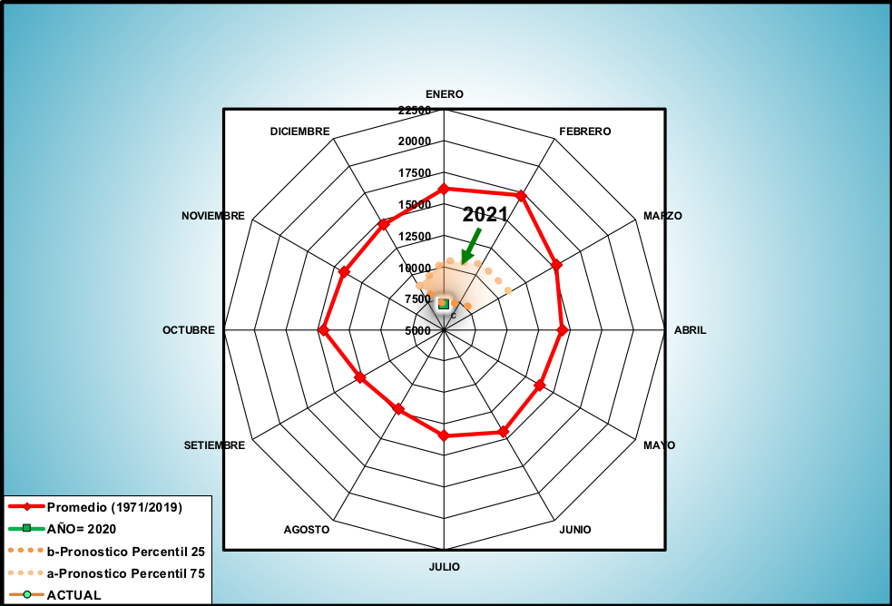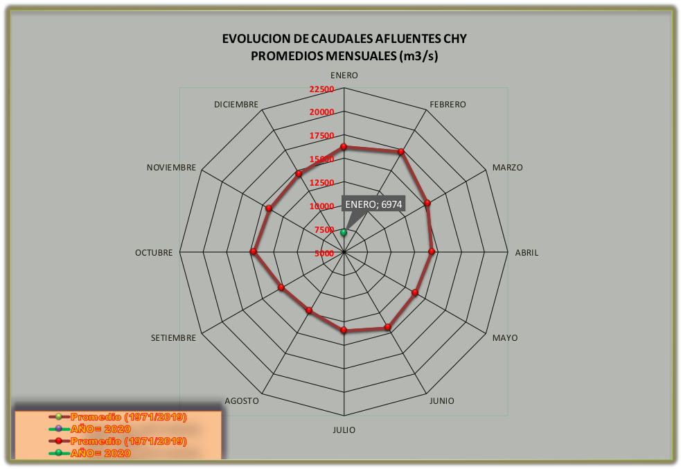El caudal afluente a la CHY diario, pronosticado para la fecha de hoy es de 6.700 m3/s, y para el día de mañana se espera una afluencia del orden de 6.900 m3/s.