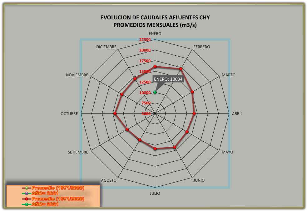 El caudal afluente a la CHY diario, pronosticado para la fecha de hoy es de 16.900 m3/s, y para el día de mañana se espera una afluencia del orden de 16.700 m3/s.