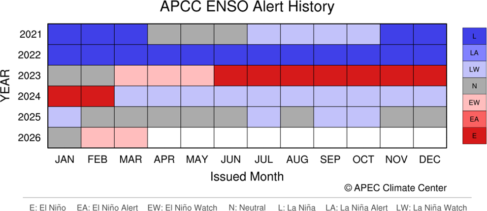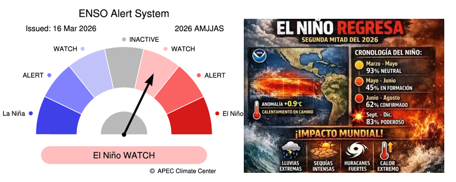 • El fenómeno de La Niña de 2025-2026 está llegando a su fin. Las temperaturas de la superficie del mar en el Pacífico tropical central han superado el umbral de La Niña (−0,80 °C) durante las últimas cuatro semanas, registrándose el último valor relativo del índice Niño3.4 para la semana que finalizó el 15 de marzo de 2026 en -0,53 °C. El calentamiento en las capas subsuperficiales sugiere que es probable que el fenómeno continúe disminuyendo en las próximas semanas.