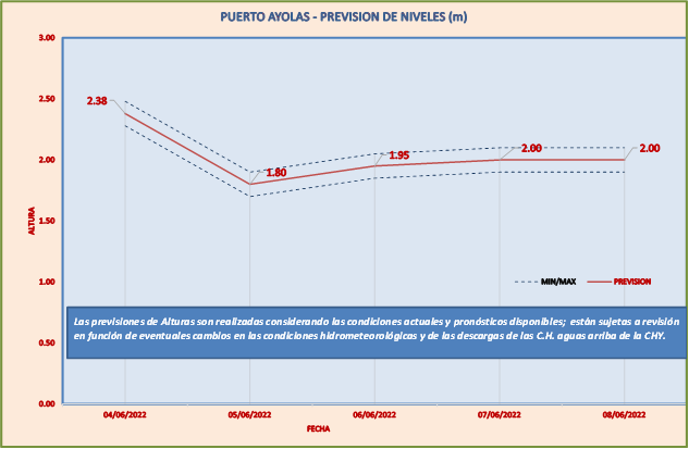 Las previsiones de Alturas son realizadas considerando las condiciones actuales y pronósticos disponibles y están sujetas a revisión en función de eventuales cambios en las condiciones hidrometeorológicas y de las descargas de las C.H. aguas arriba de la CHY.