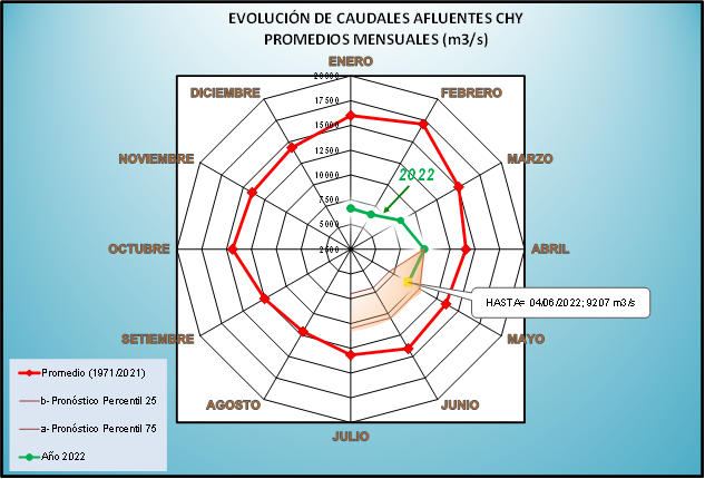 El caudal afluente a la CHY diario, pronosticado para la fecha de hoy es de 17.000 m3/s, y para el día de mañana se espera una afluencia del orden de 16.100 m3/s.