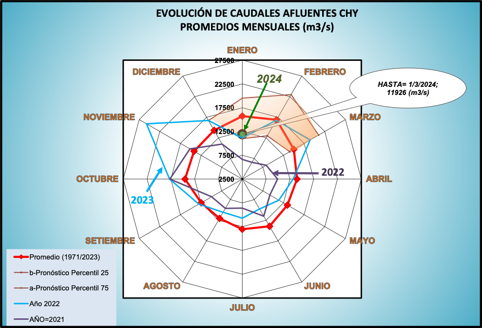 El caudal afluente a la CHY diario, pronosticado para la fecha de hoy es de 13.900 m3/s, y para el día de mañana se espera una afluencia del orden de 13.600 m3/s.