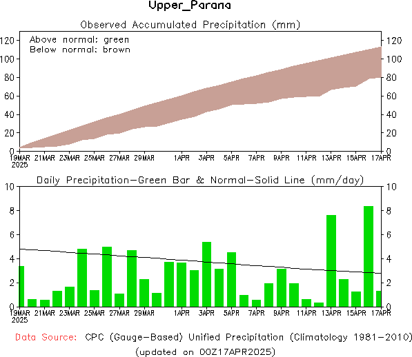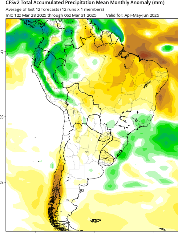 Para el trimestre considerado, se prevén valores infeiores a la normal en gran parte de la región oriental, mientras que en el resto del territorio nacional, se esperan condiciones normales.