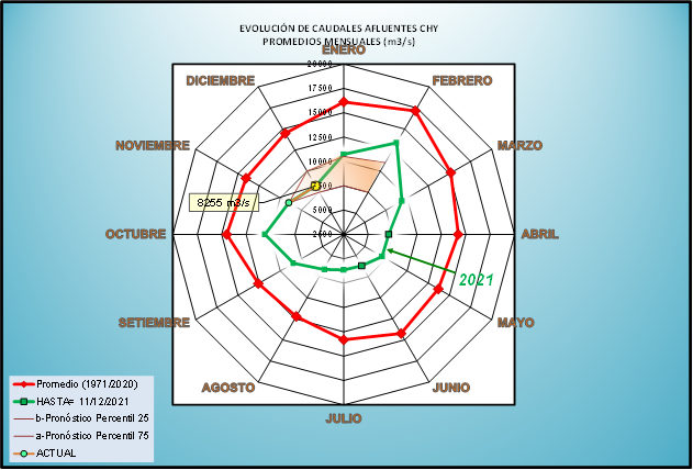 El caudal afluente a la CHY diario, pronosticado para la fecha de hoy es de 7.100 m3/s, y para el día de mañana se espera una afluencia del orden de 7.500 m3/s.