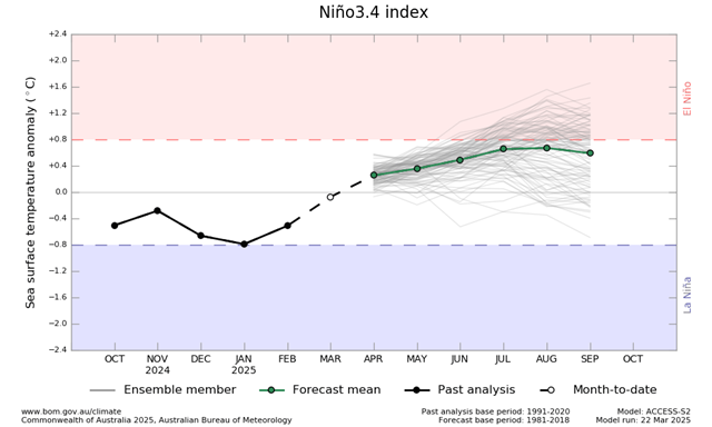 El fenómeno de El Niño-Oscilación del Sur (ENSO) es neutro, y tanto las temperaturas superficiales del mar (TSM) en el Océano Pacífico ecuatorial central como los patrones atmosféricos se encuentran en niveles neutros respecto de El Niño. Los índices atmosféricos, como los relacionados con los patrones de presión superficial, nubes y vientos alisios, son en general consistentes con un estado neutro respecto de El Niño. Aunque algunos han mostrado señales similares a las de La Niña durante las últimas semanas, estas señales no han sido consistentes.
