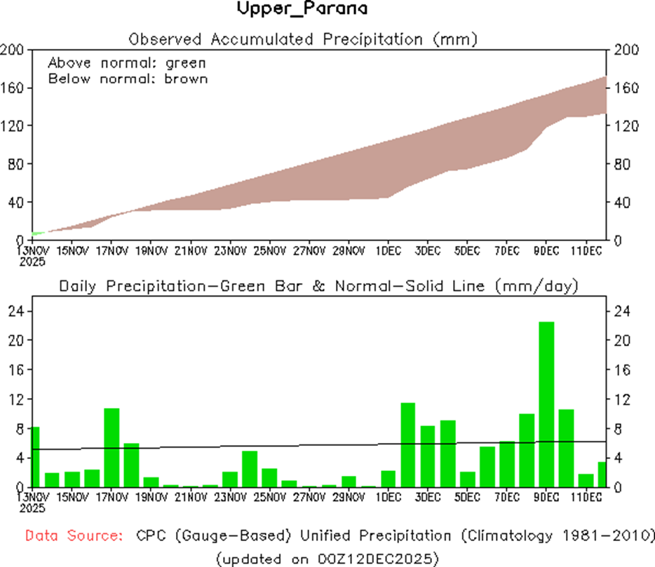 • Las observaciones en el océano Pacífico tropical han sido consistentes con condiciones de La Niña desde principios de octubre. El último valor relativo del índice de TSM Niño3.4 para la semana que finalizó el 23 de noviembre de 2025 fue de -0,93 °C. Los valores sostenidos por debajo de -0,8 °C son consistentes con un patrón de La Niña. Los valores semanales del índice relativo Niño3.4 han fluctuado alrededor del umbral de La Niña desde mediados hasta finales de septiembre.