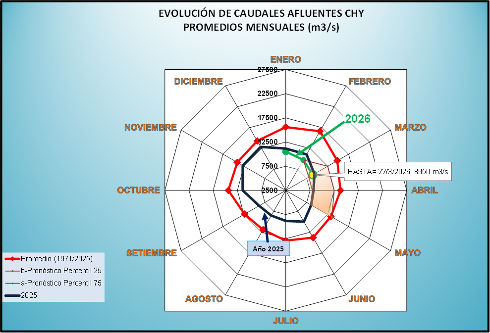 El caudal afluente a la CHY diario, pronosticado para la fecha de hoy es de 9.200 m3/s, y para el día de mañana se espera una afluencia del orden de 8.700 m3/s.
