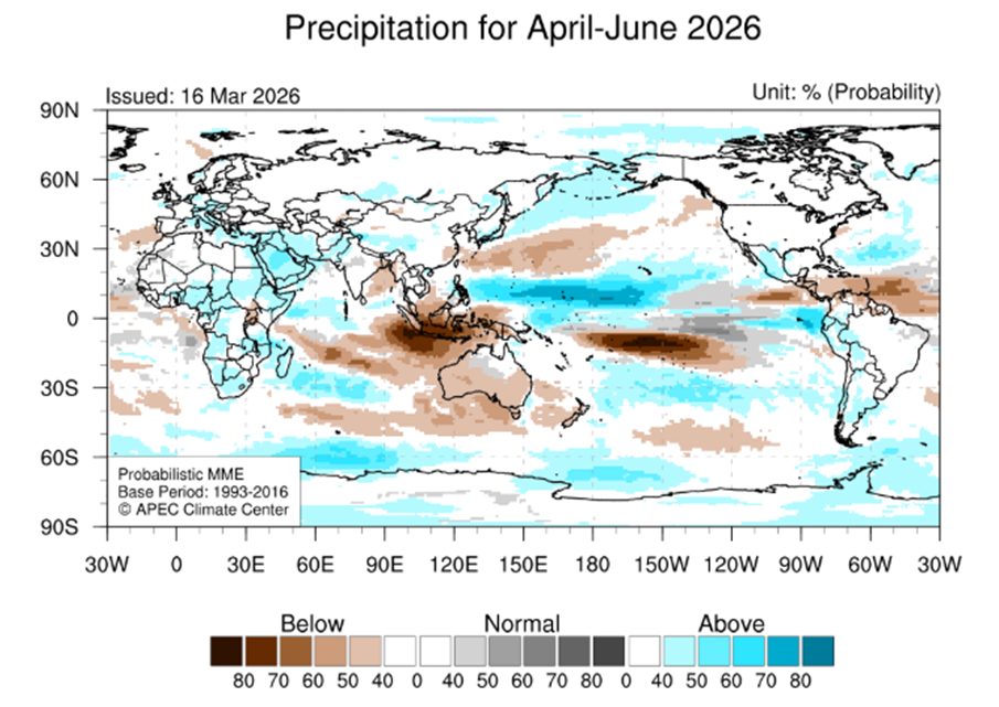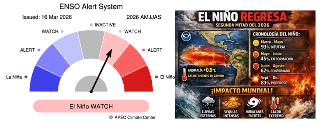 • El fenómeno de La Niña de 2025-2026 está llegando a su fin. Las temperaturas de la superficie del mar en el Pacífico tropical central han superado el umbral de La Niña (−0,80 °C) durante las últimas cuatro semanas, registrándose el último valor relativo del índice Niño3.4 para la semana que finalizó el 15 de marzo de 2026 en -0,53 °C. El calentamiento en las capas subsuperficiales sugiere que es probable que el fenómeno continúe disminuyendo en las próximas semanas.