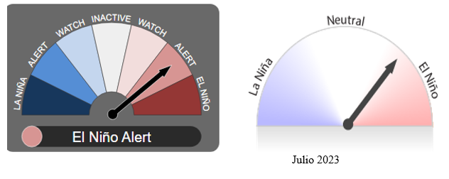 La Perspectiva ENSO está en Alerta El Niño. Cuando los criterios de Alerta de El Niño se han cumplido en el pasado, un evento de El Niño se ha desarrollado alrededor del 70% del tiempo.