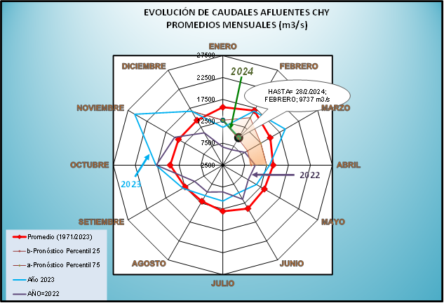 El caudal afluente a la CHY diario, pronosticado para la fecha de hoy es de 10.500 m3/s, y para el día de mañana se espera una afluencia del orden de 10.800 m3/s.