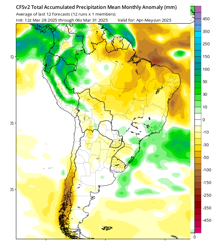Para el trimestre considerado, se prevén valores infeiores a la normal en gran parte de la región oriental, mientras que en el resto del territorio nacional, se esperan condiciones normales.