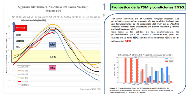 La evolución de índices climáticos publicados por organismos especializados de referencia, vinculados con la previsión del fenómeno caracterizado como “El Niño”, hace prever con un grado de probabilidad alto, que durante el periodo enero y marzo 2024 podrían verificarse eventos hidrológicos asociados a situaciones de aguas altas.