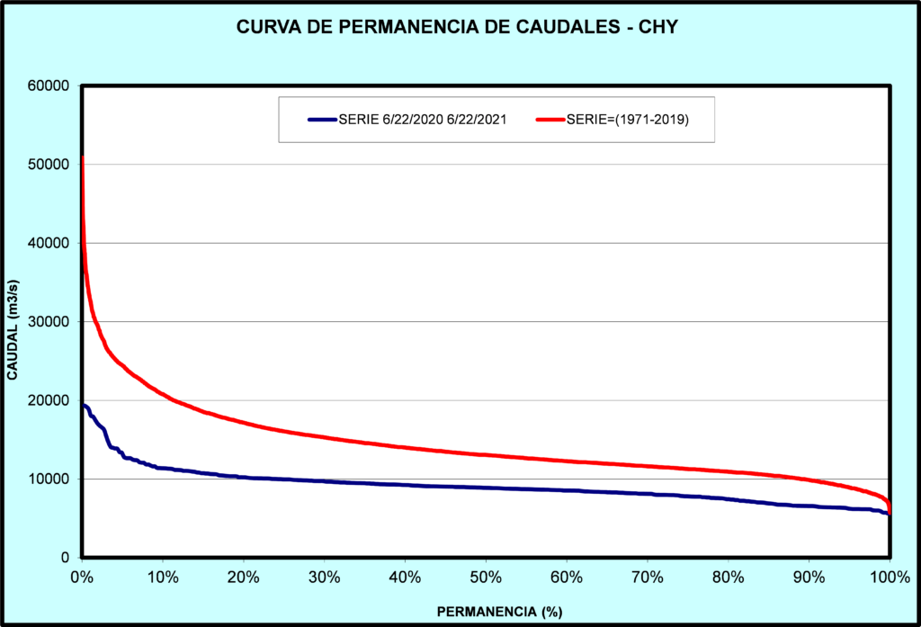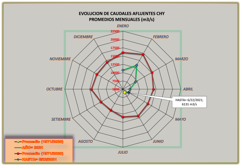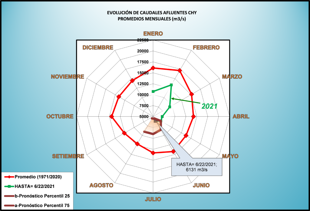 El caudal afluente a la CHY diario, pronosticado para la fecha de hoy es de 5.800 m3/s, y para el día de mañana se espera una afluencia del orden de 6.000 m3/s.