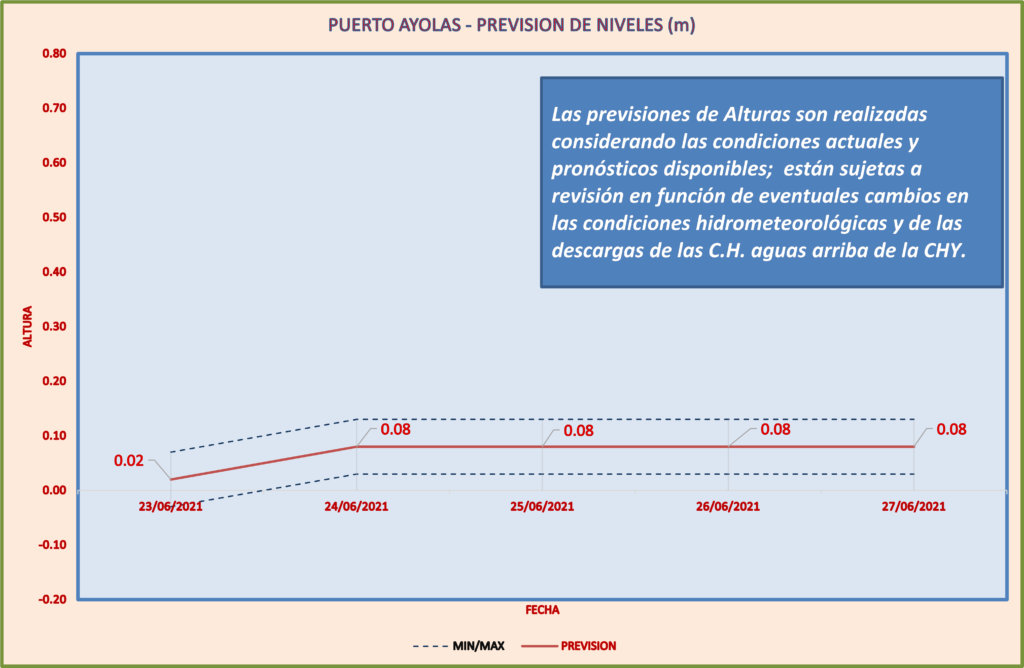 Las previsiones de Alturas son realizadas considerando las condiciones actuales y pronósticos disponibles y están sujetas a revisión en función de eventuales cambios en las condiciones hidrometeorológicas y de las descargas de las C.H. aguas arriba de la CHY.