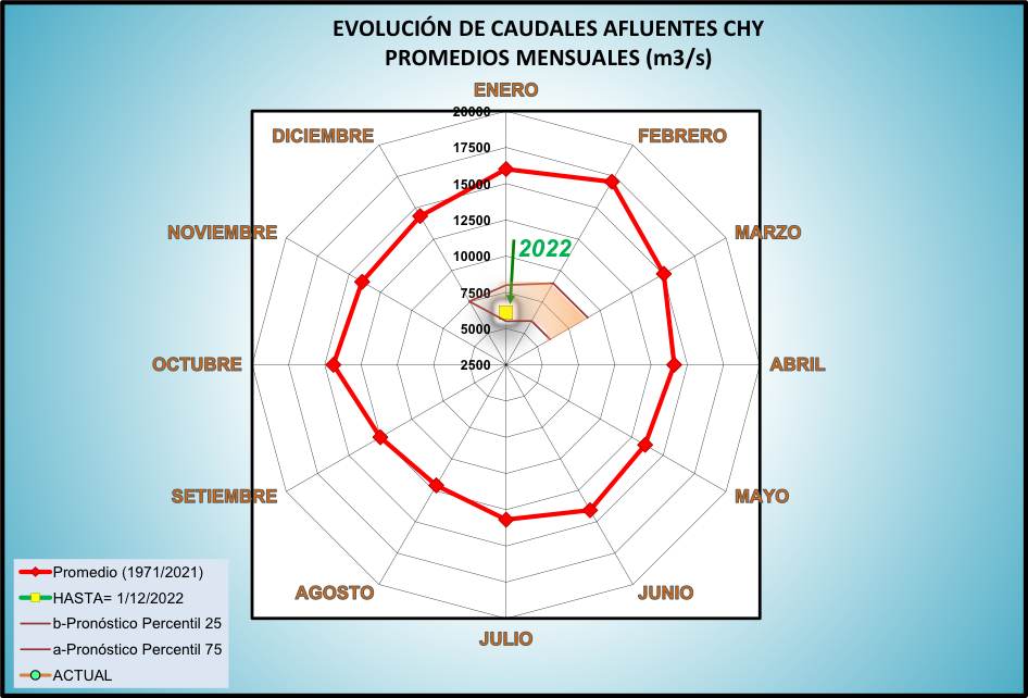 El caudal afluente a la CHY diario, pronosticado para la fecha de hoy es de 7.000 m3/s, y para el día de mañana se espera una afluencia del orden de 7.300 m3/s.