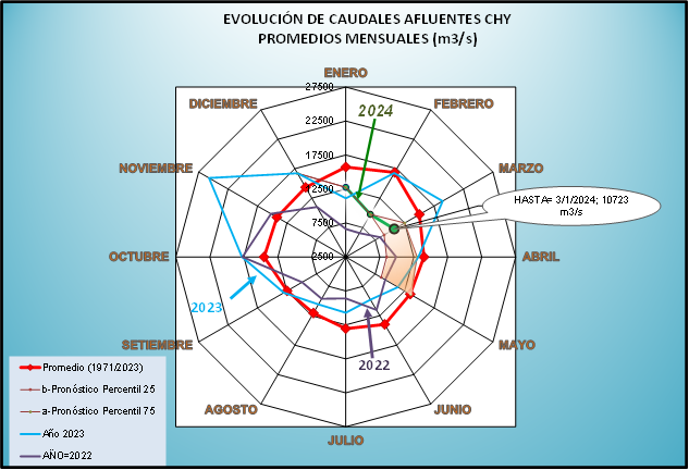 El caudal afluente a la CHY diario, pronosticado para la fecha de hoy es de 10.800 m3/s, y para el día de mañana se espera una afluencia del orden de 10.800 m3/s.