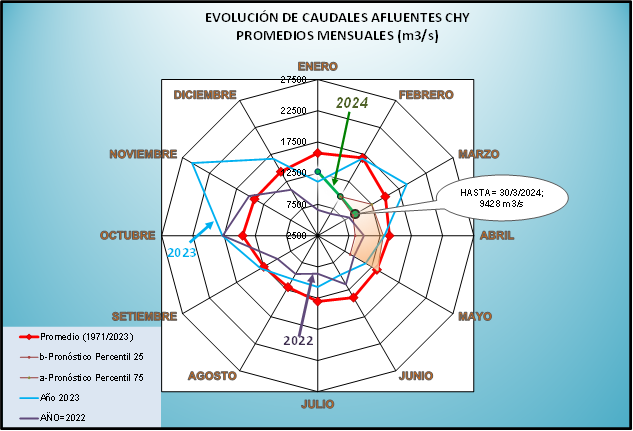 El caudal afluente a la CHY diario, pronosticado para la fecha de hoy es de 7.300 m3/s, y para el día de mañana se espera una afluencia del orden de 7.000 m3/s.