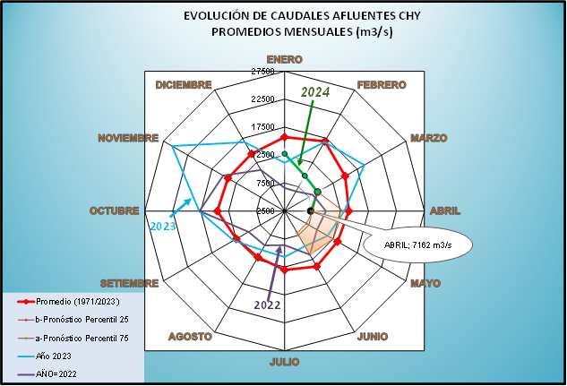 El caudal afluente a la CHY diario, pronosticado para la fecha de hoy es de 7.600 m3/s, y para el día de mañana se espera una afluencia del orden de 8.100 m3/s.