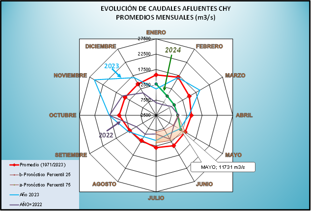 El caudal afluente a la CHY diario, pronosticado para la fecha de hoy es de 8.300 m3/s, y para el día de mañana se espera una afluencia del orden de 7.800 m3/s.