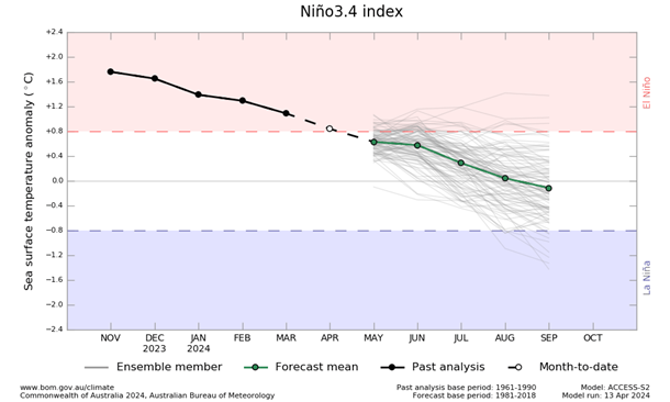 La Perspectiva ENSO se encuentra actualmente en ‘Vigilancia de La Niña’, lo que significa que hay algunas señales de que La Niña podría formarse en el Océano Pacífico más adelante en 2024. Los indicadores atmosféricos y oceánicos se encuentran actualmente dentro de los umbrales neutrales de ENSO.