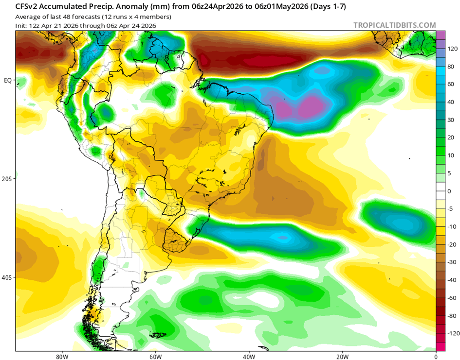- El análisis de la temperatura superficial del mar (TSM) correspondiente a la semana que finalizó el 12 de abril de 2026 muestra aguas cercanas al promedio o ligeramente más frías que el promedio (hasta 2 °C por debajo del promedio) al norte y al oeste de Australia. Las aguas son más cálidas que el promedio (hasta 2 °C por encima del promedio) en la mayor parte del resto de Australia, especialmente en el sureste.