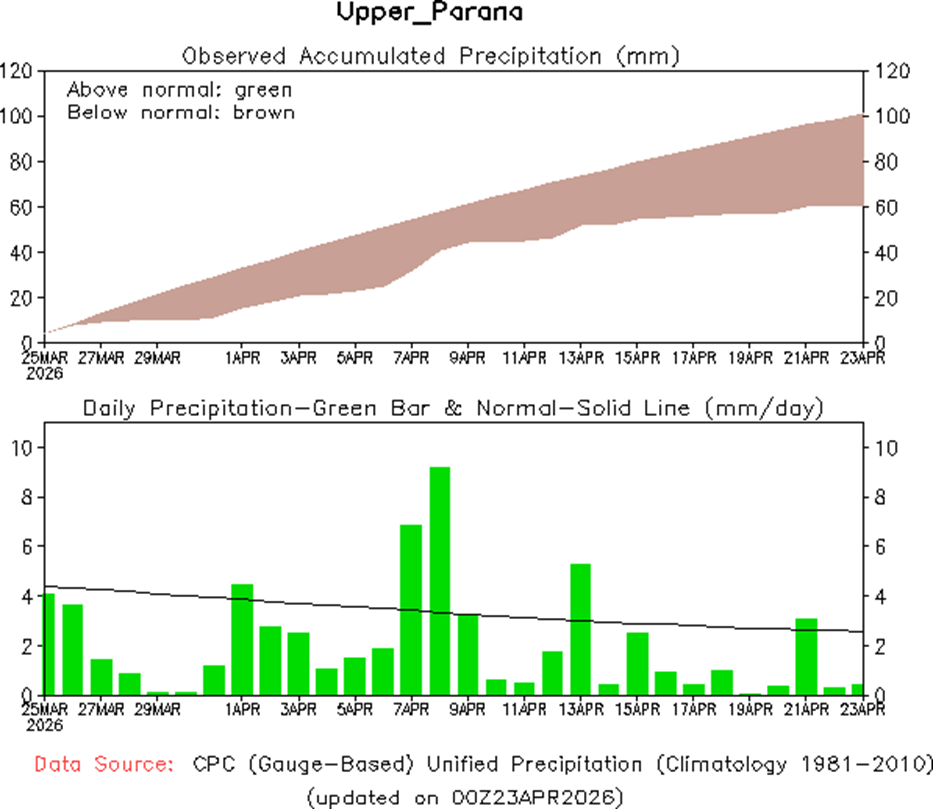 - El fenómeno El Niño-Oscilación del Sur (ENSO) se encuentra actualmente en fase neutra. El último valor relativo del índice Niño3.4 para la semana que finalizó el 12 de abril de 2026 es de -0,27 °C, situándose firmemente dentro del rango neutro del ENSO (de -0,80 a +0,80 °C). Los valores relativos del índice Niño3.4 han experimentado un calentamiento constante desde el final del verano del hemisferio sur. Un reciente aumento repentino del calentamiento en el subsuelo sugiere que es probable que se produzca un mayor calentamiento de la temperatura superficial del mar en las próximas semanas.