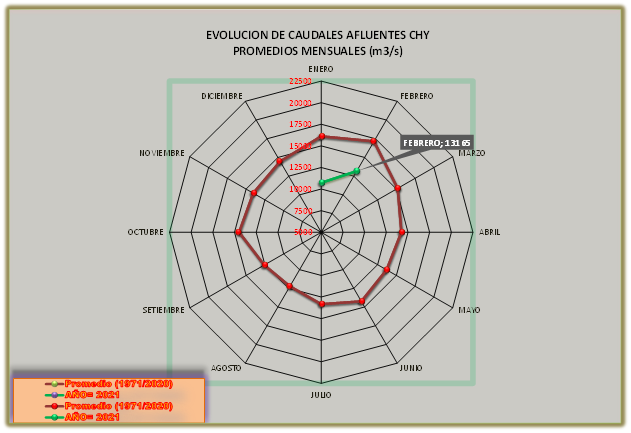 El caudal afluente a la CHY diario, pronosticado para la fecha de hoy es de 8.700 m3/s, y para el día de mañana se espera una afluencia del orden de 8.900 m3/s.