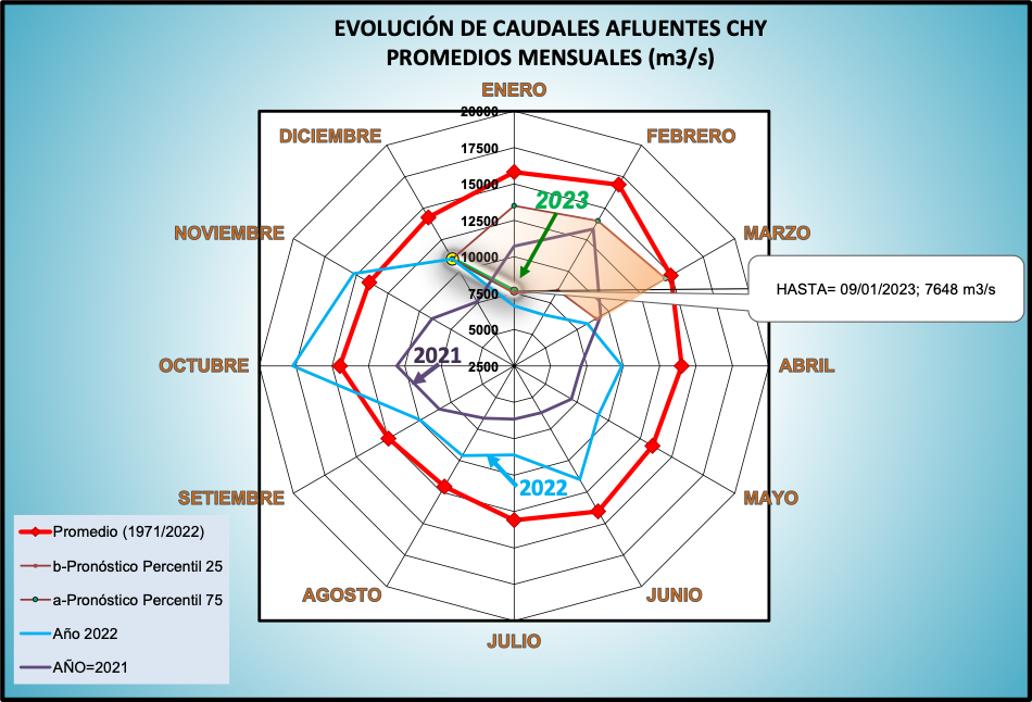El caudal afluente a la CHY diario, pronosticado para la fecha de hoy es de 8.700 m3/s, y para el día de mañana se espera una afluencia del orden de 9.500 m3/s.
