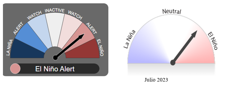 La Perspectiva ENSO está en Alerta El Niño. Cuando los criterios de Alerta de El Niño se han cumplido en el pasado, un evento de El Niño se ha desarrollado alrededor del 70% del tiempo.